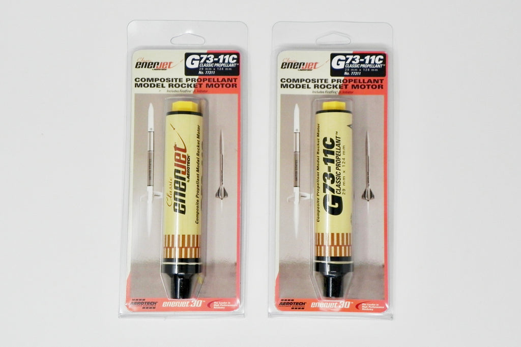 The G73C rocket motor is available in 7 (No. 77308), 11 (No. 77311) and 15 (No. 77315) second time delays and features a molded phenolic casing with integral thrust ring. Display packaged in a single-motor clamshell with a FirstFire™ Jr.